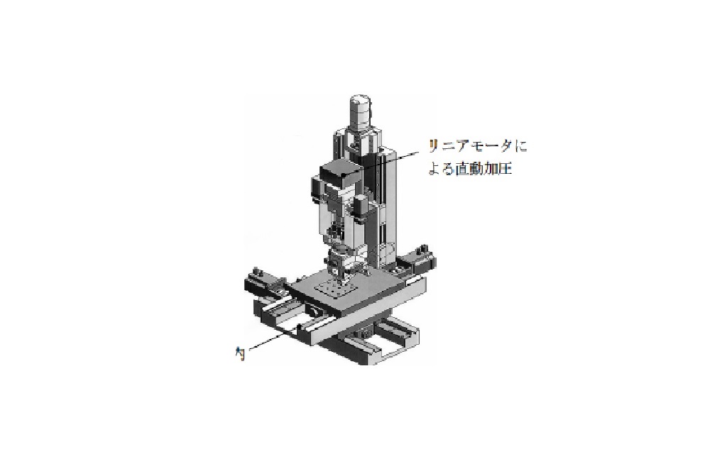 摩擦レスのリニアモータ加圧とダメージのない高速接触検知により、高速・高精度で高品位な加圧に対応できる立軸ステージの技術です。リニアモータ及びバランスシリンダー(改良した市販低摩擦シリンダー)駆動で自成絞り方式の空気静圧パッドによりテーブル重量軽減を小さく抑えることが可能です。また、ステージは低摩擦のV-V形状(真直性優)の滑り案内と平行ばね形継手およびテーブル上面制御方法により、姿勢変化が少なく高負荷に耐える高精度ステージです。これらの応用商品として、高精度のレーザー加工機やフリップチップボンダーがあります。自動化設備においてワークは精密に位置決めされなければなりません。そこで、ワークに対して仕事をするポイント(ステーション)では、 精密ステージというモジュールが必要となります。モジュール形態としては、“直交2軸:XY型”とZ軸との組み合わせが一般的です。用途に応じて、上下動作に様々なスピンドルを搭載して加工・組立・検査動作等を行う事が可能です。